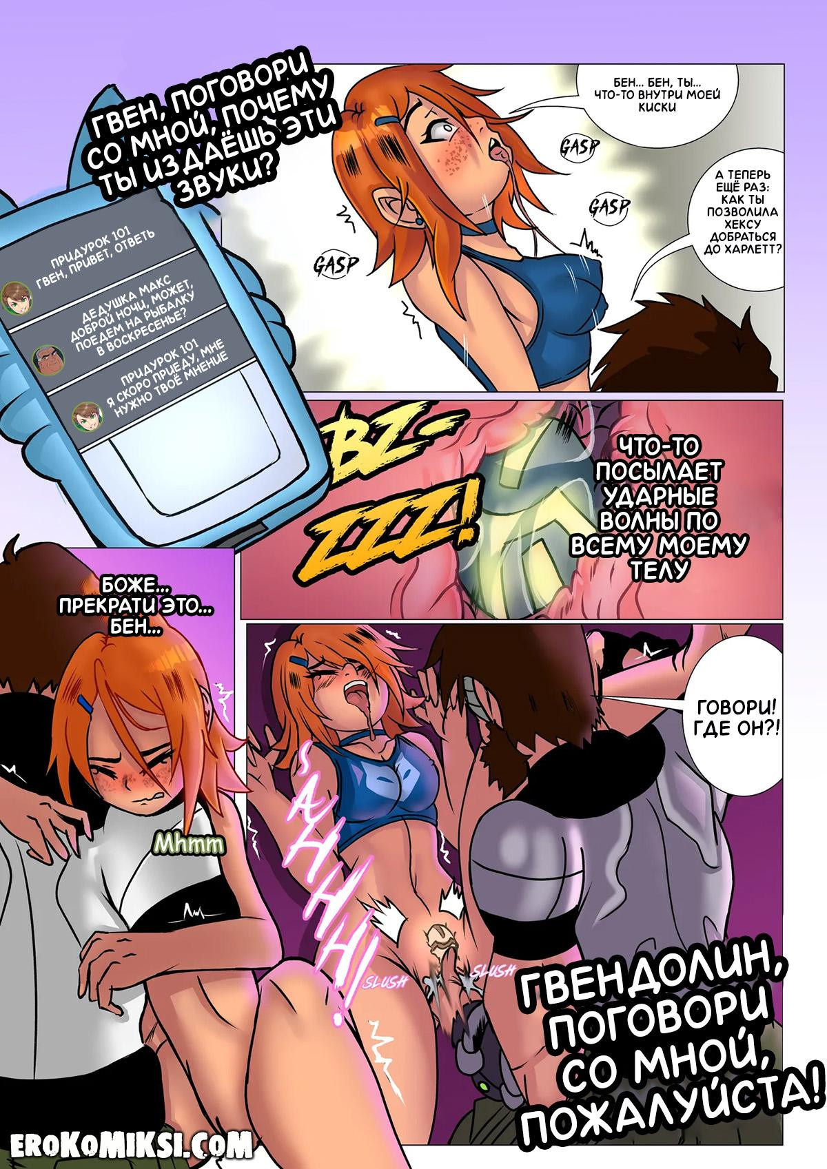 Порно комикс Бен 10. Желания Гвен. Гвен была не очень довольна своей маленькой задницей и попросила у заклинателя увеличить её, однако, заклинатель начал убеждать её, что она и так прекрасна и показал ей, что у него и так встаёт на неё член. При виде огромного члена заклинателя, Гвен сильно возбуждается и начинает играть со своей влажной киской…