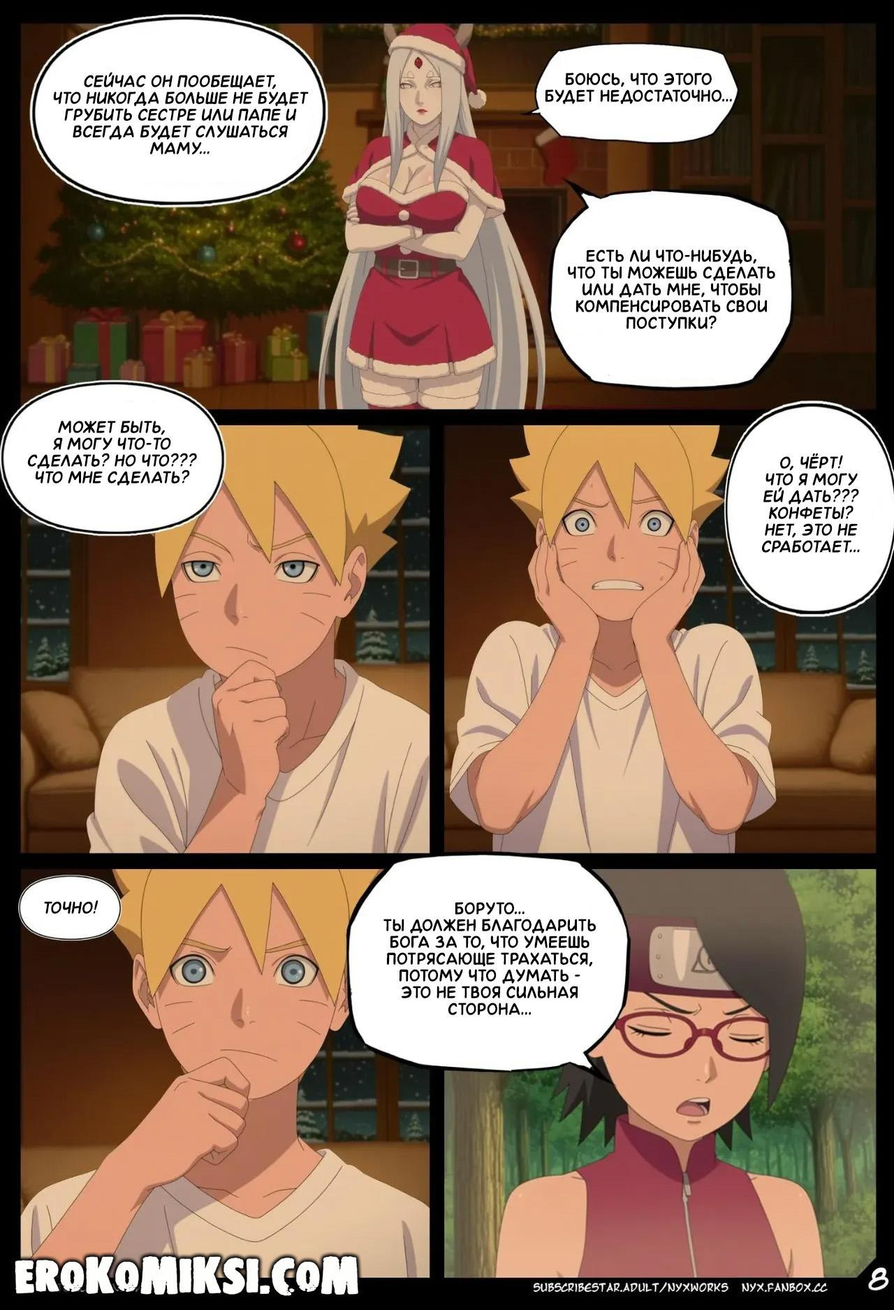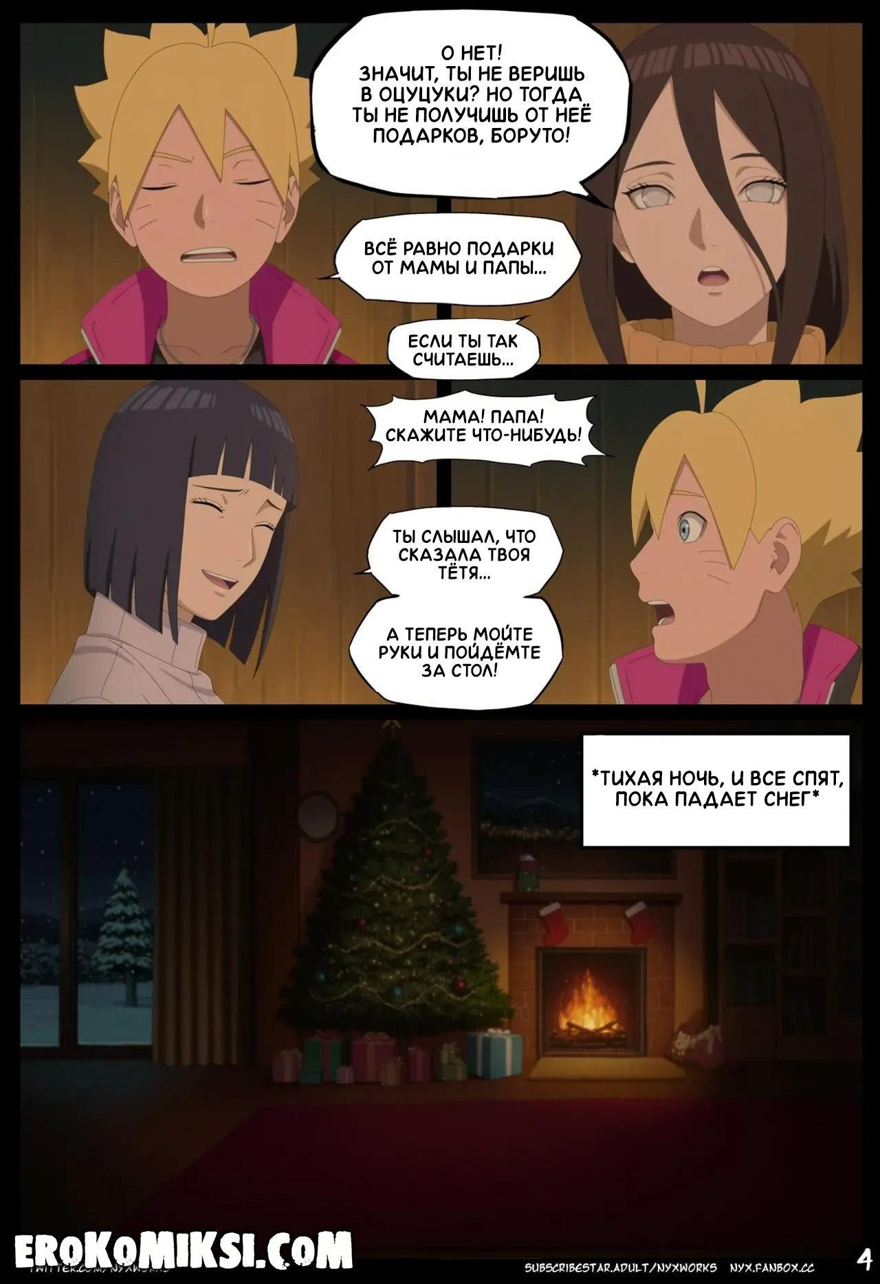 Порно комикс Боруто. Рождество с Оцуцуки. Семья Узумаки отправилась в загородный дом на Рождество, где Ханаби рассказала историю про рождественскую Оцуцуки и лишь один Боруто не поверил в эти страшилки. Каково же было его удивление, когда среди ночи он встретил Оцуцуки под ёлкой и теперь, Боруто предстояло расплачиваться за своё плохое поведение своим большим членом…