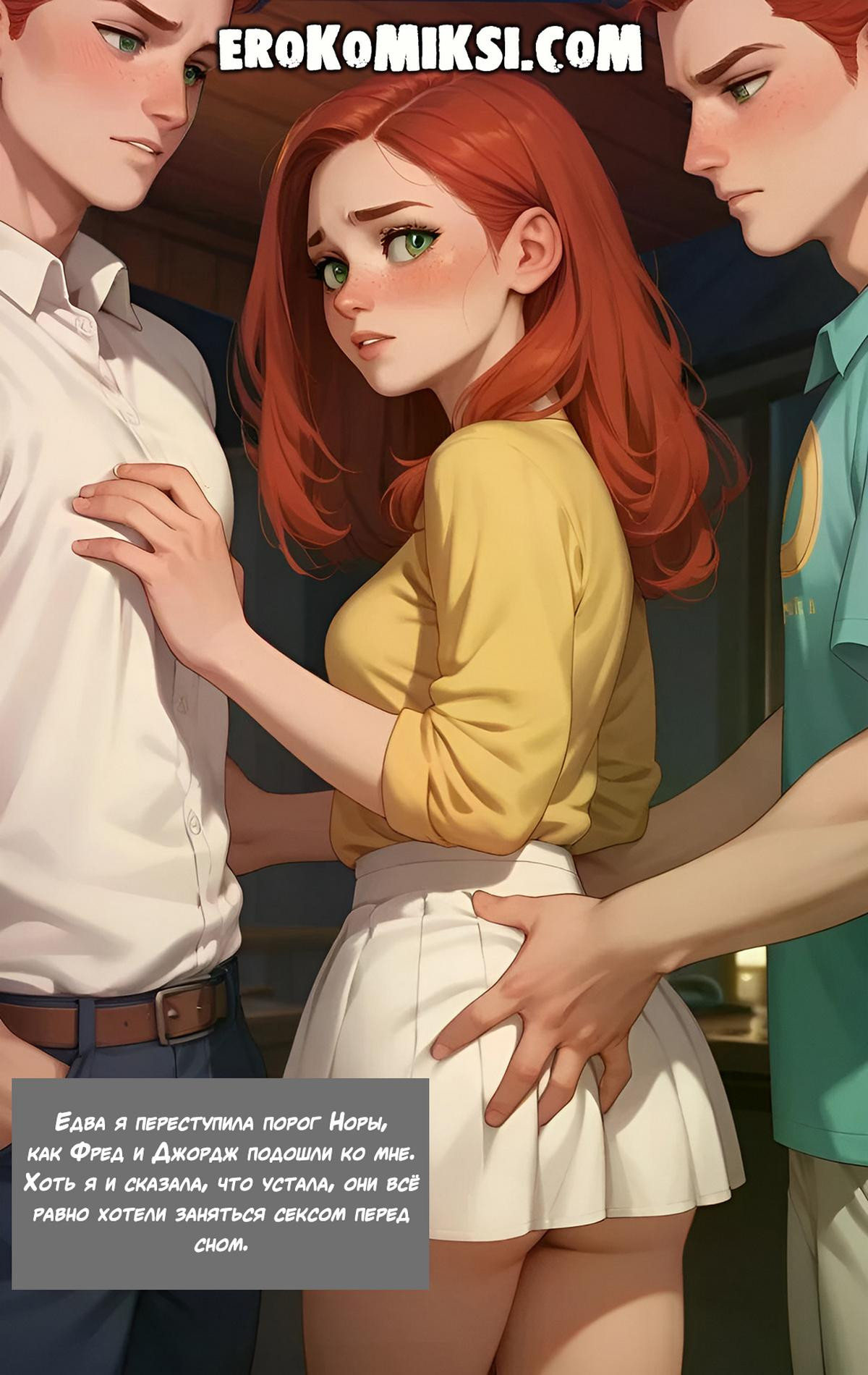 Порно комикс Джинни Уизли Секс игрушка для своих братьев. Часть 2. Рыжая красавица Джинни продолжает ублажать своих братьев. Парни раздевают девушку и дают ей пососать свой крупные члены, после чего хорошенько трахают ее во все дырочки…