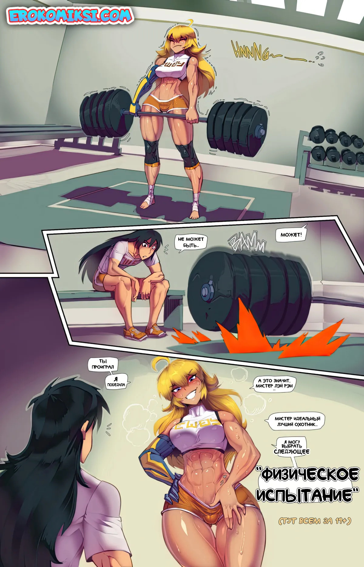 Порно комикс Физическое испытание. Поспорив с охотником, героиня выигрывает, и теперь её черёд выбирать следующее испытание. Она просит парня сделать 50 флагов дракона, но т.к. в спортзале нет столбов, красотка сама становится для него противовесом, обнажая своё тело и позволяя парню прильнуть к её киске…
