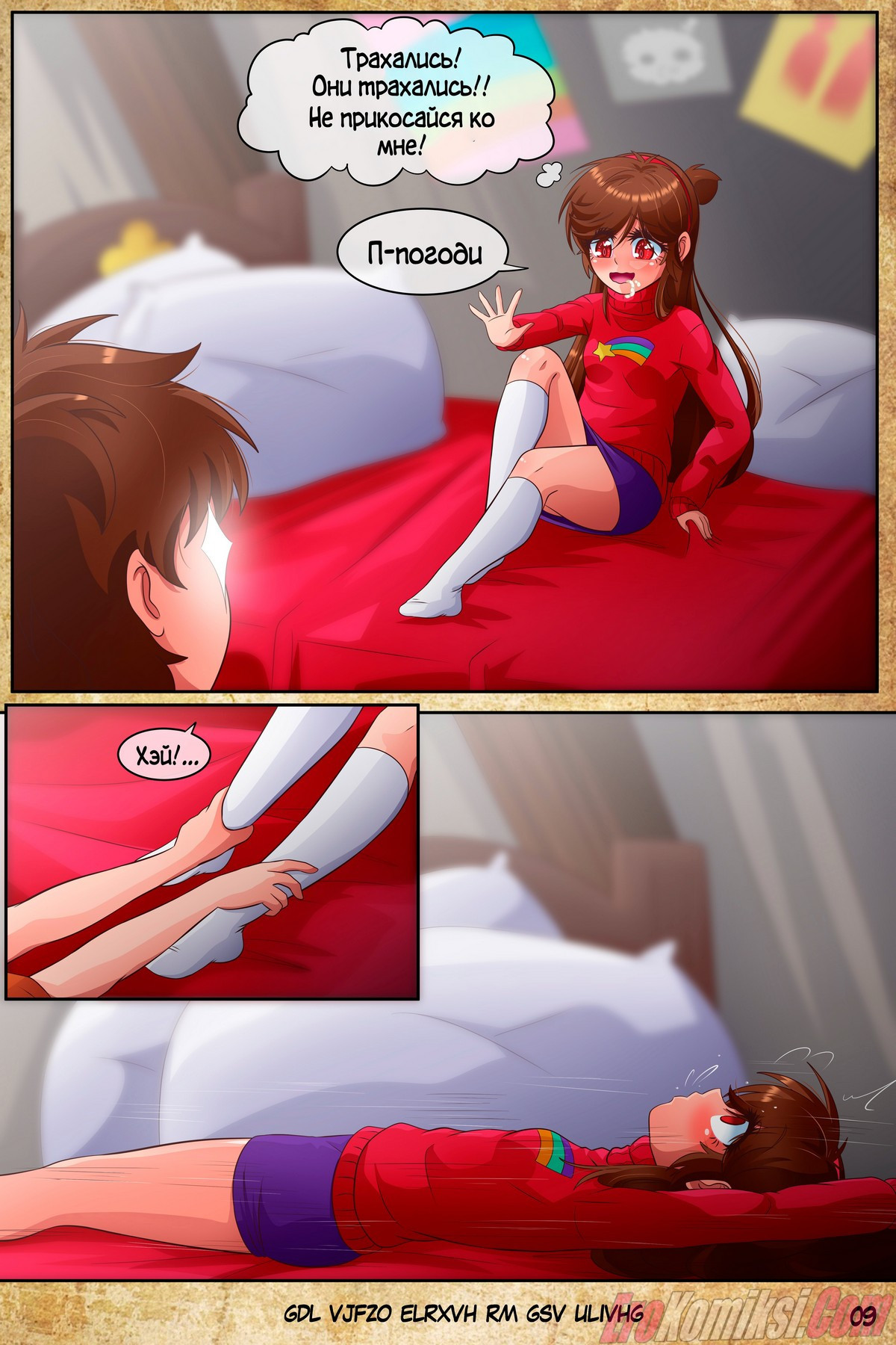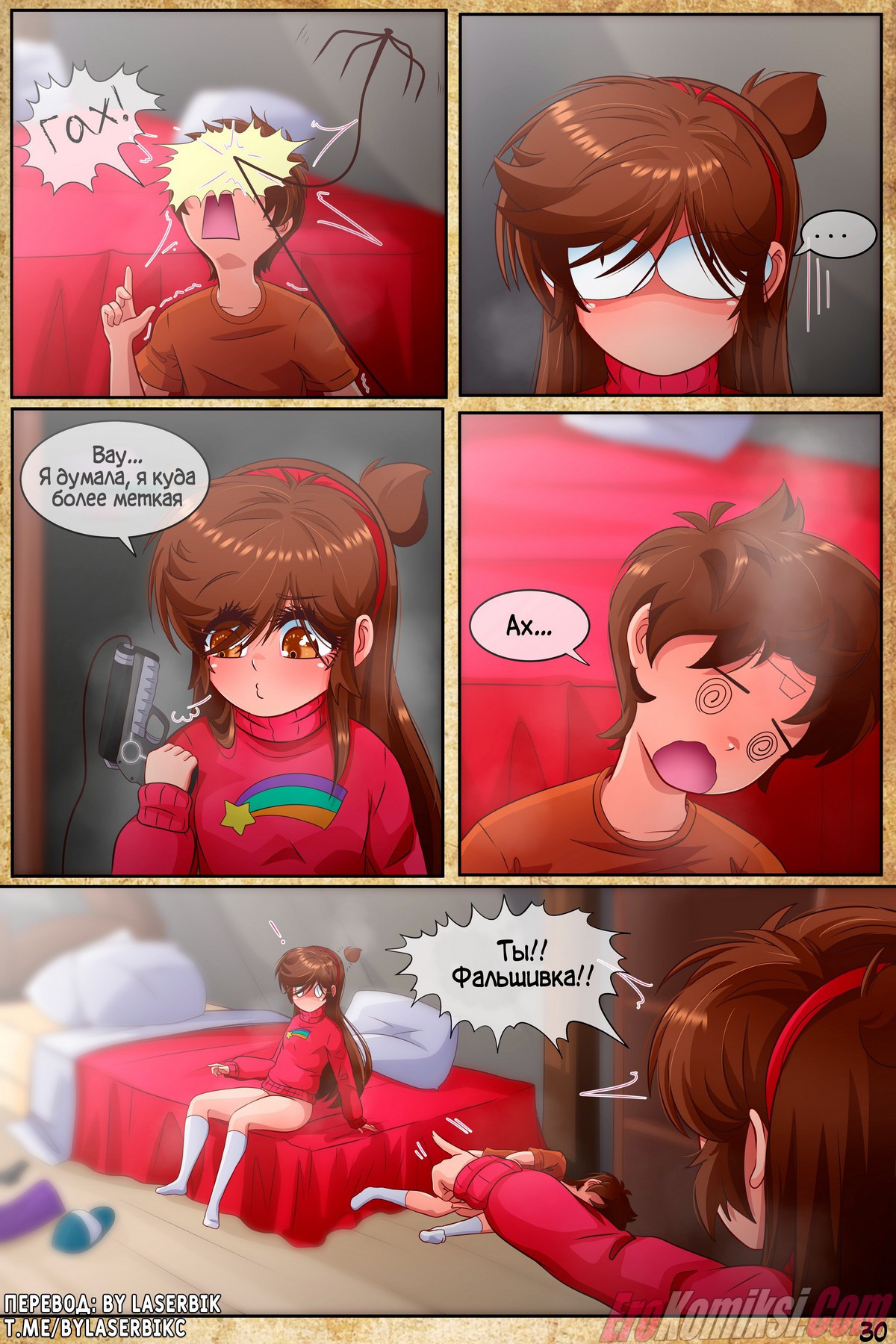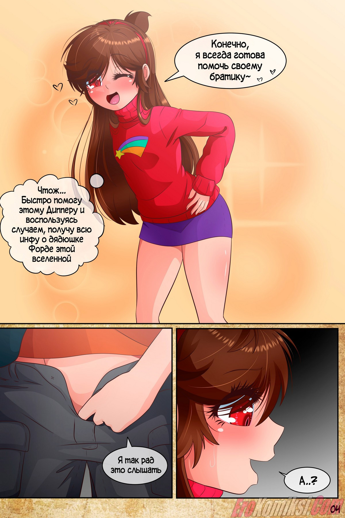 Порно комикс Гравити Фолз: Подделка. Часть 1. Антимэйбл снова попала в этот мир и наткнулась на Диппера, который попросил продолжить то, что они делали этим утром. Притворившись оригинальной Мэйбл, она хотела по быстрому помочь брату и пойти к дяде Стэну, но девушка не знала, что речь идёт о сексе…
