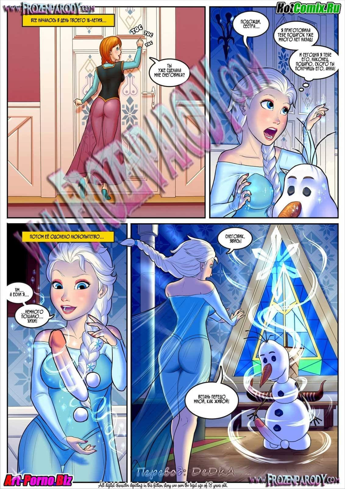 Очередная часть порно комикса холодное сердце покажет Анну, запертую в камеру со снеговиком Олафом. Девушка продумывает план побега и ей, как совсем не глупой особе приходит в голову очень даже интересная идея. Она решает открыть решетку темницы в тот момент, когда охранники пойдут чего-нибудь съесть. А то, что у нее и Олафа нет ключа, Анну особо не тревожит. Ведь она уже придумала, из чьего достоинства можно сделать ключ, который даст ей свободу.