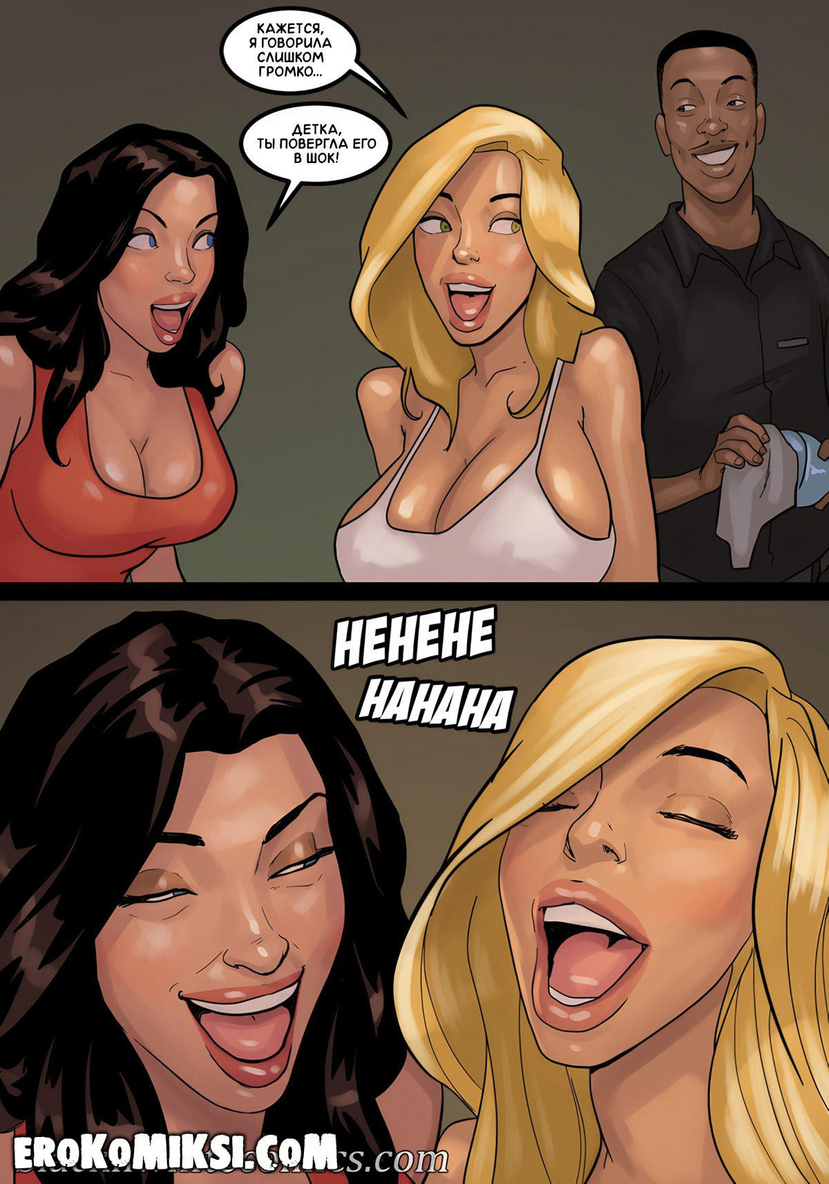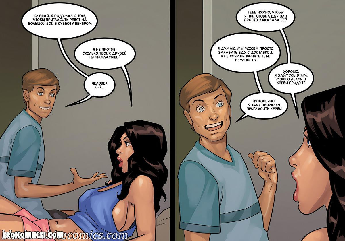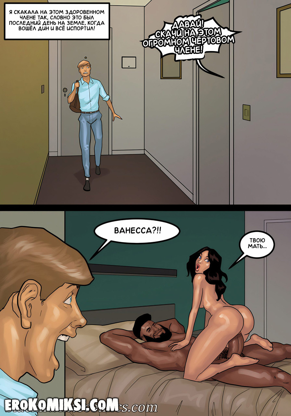 Порно комикс Игра в покер. Часть 4. Молодая озабоченная домохозяйка всю утро ждала почтальона и когда он наконец-то пришёл, она затащила его домой, чтобы как следует поразвлечься с его огромным чёрным членом, а чтобы ощущения были ещё пикантнее, она позволила своему муженьку куколду наблюдать за ними…