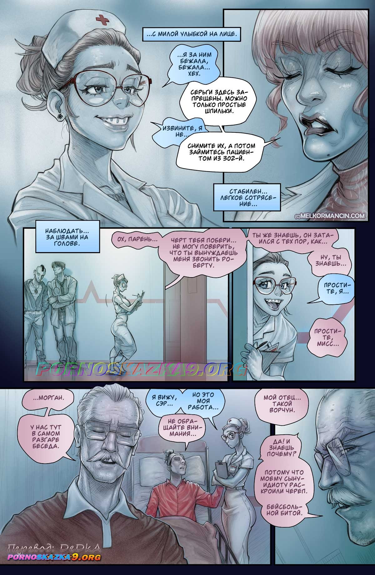 Порно комикс Медсестра Морган. Девушка по имени Морган трудится медсестрой. Она обожает свою работу. Но бывает на этой работе происходит такое, о чем хочется обязательно, хоть кому-нибудь все рассказать, а даже точнее — выговориться, либо на месте не усидишь! И таким внимательным собеседником, которому можно излить всю душу, оказался для Морган ее дневник, так называемый своеобразный журнал медсестры, в котором девушка и описывает все прелести своей нелегкой работы…