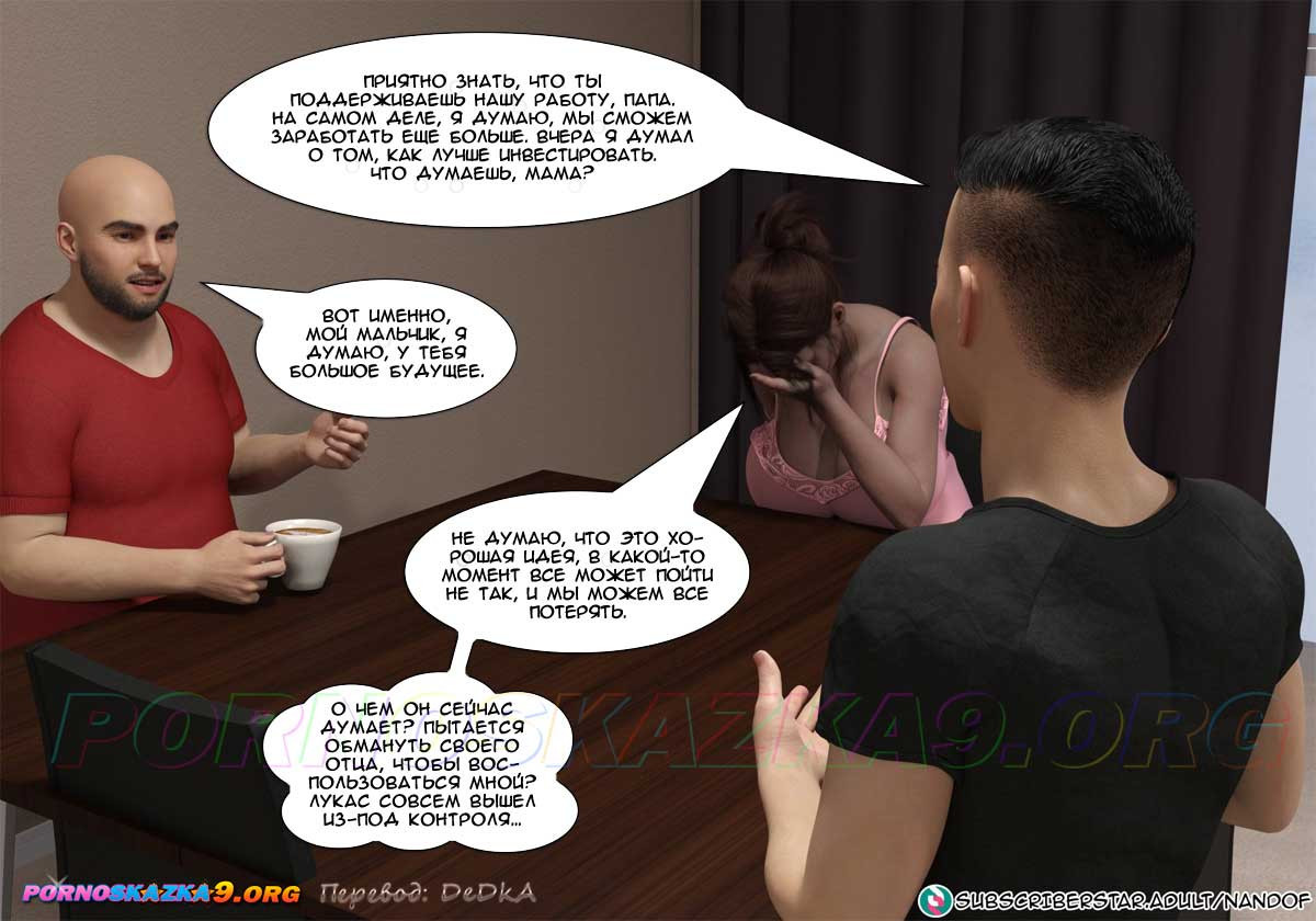 Порно комикс Моя мама порнозвезда. Часть 6. Глория сказала мужу, что с помощью Лукаса ей яко бы удалось сделать онлайн-инвестицию и получить доход, достаточный для того, чтобы оплатить долги по ипотеке, но так как это рискованный бизнес, она не намерена продолжать. Но муж, который сейчас не имеет работы, попросил ее подумать о том, чтобы продолжить это дело… Знал бы он в чем заключается эта совместная работа его жены и сына…