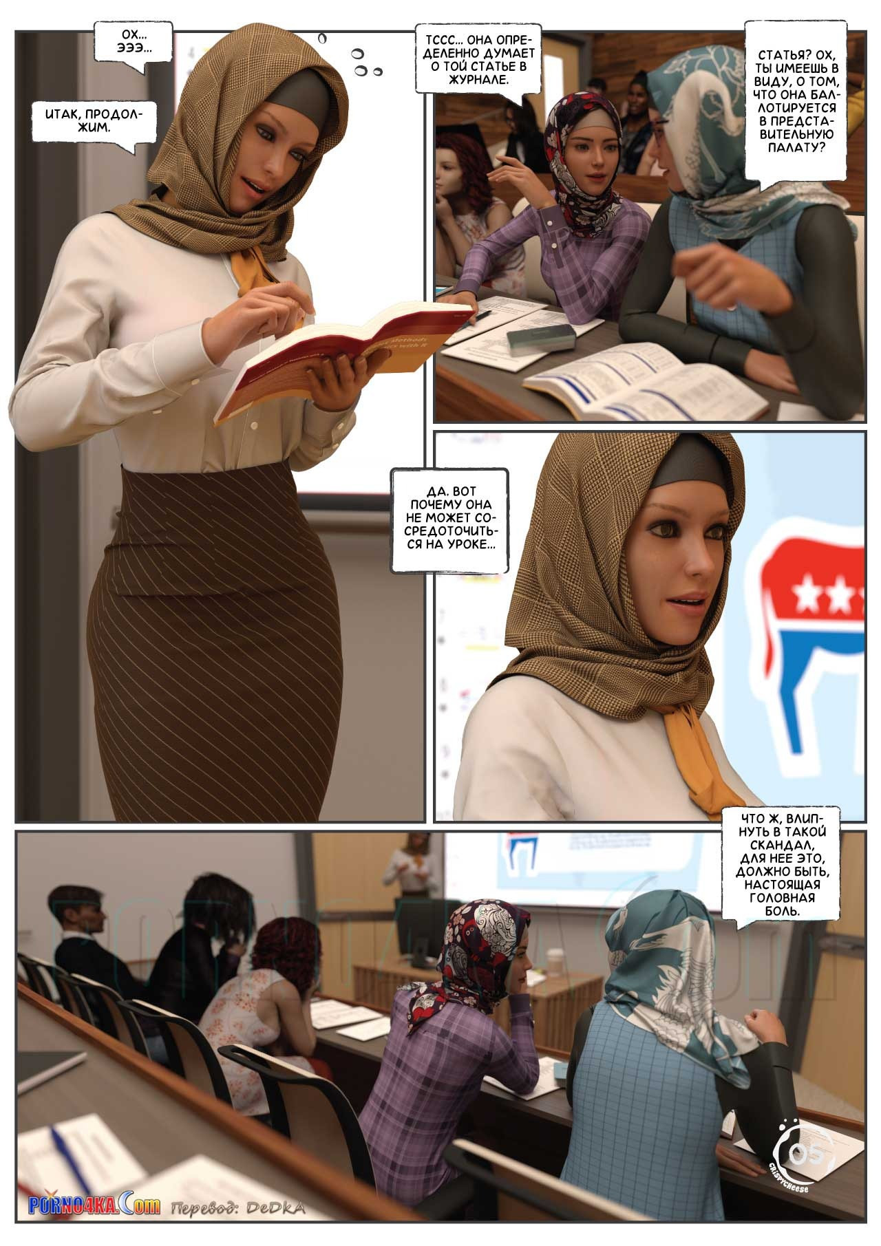 Порно комикс Непристойный договор. Часть 1. Магистр факультета политических наук университета Грин-Оук очаровательная профессор Халима Омар баллотируется в Палату представителей. И кое-кто из ее поклонников решил, что для того, чтобы повысить ее рейтинг, нужно сделать ее более известной среди избирателей. А что быстрее всего может принести известность и популярность? Конечно, сексуальный скандал!