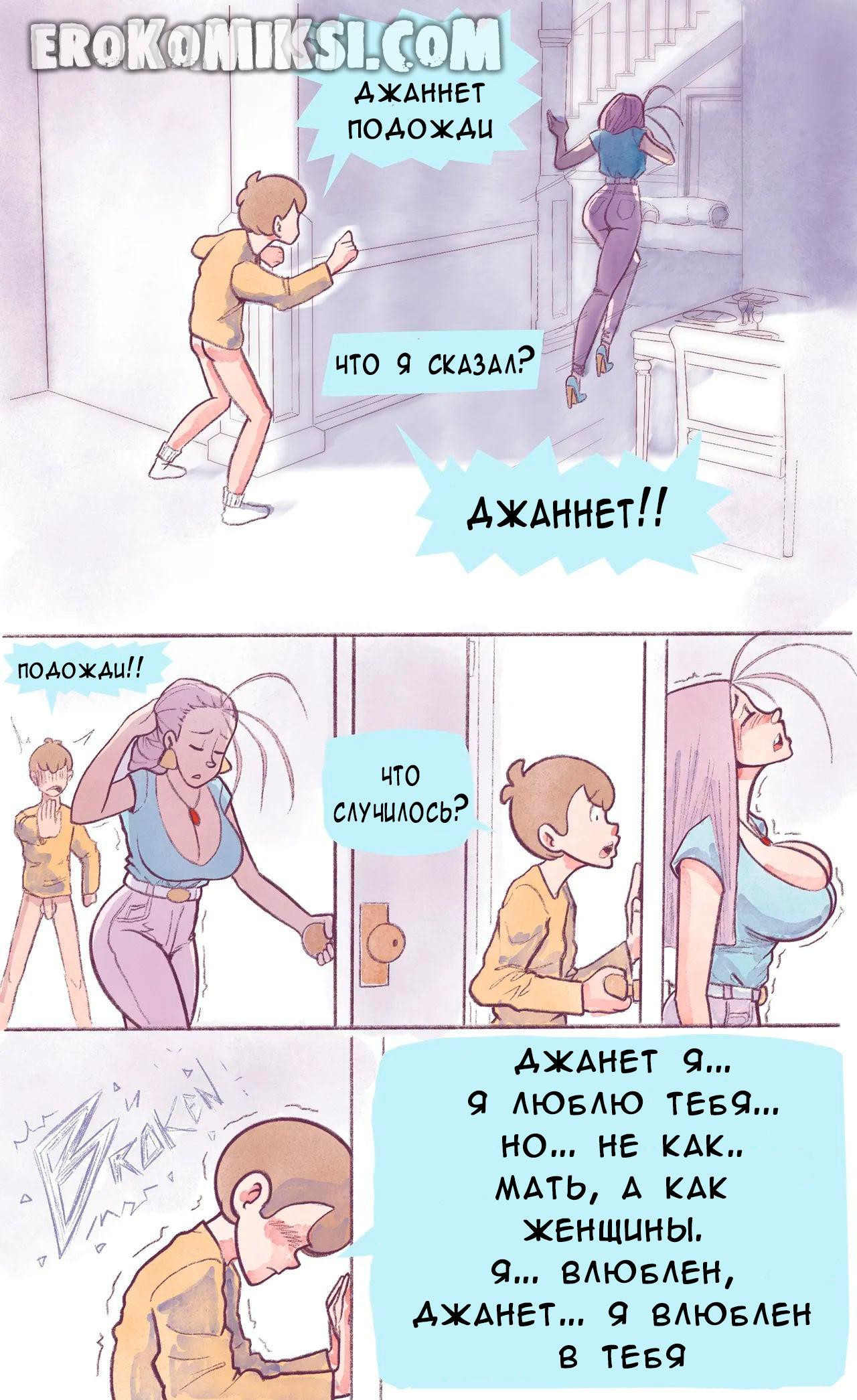 Порно комикс Ну очень наивная мама. Горячая милфа Джанет проснулась после ночи ебли с Томми и пошла мыть посуду, чтобы себя немного успокоить. Парень скрытно подобрался сзади к мачехе и хорошо удивил ее своим большим членом…