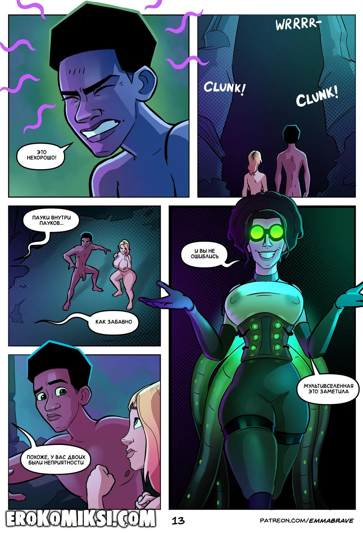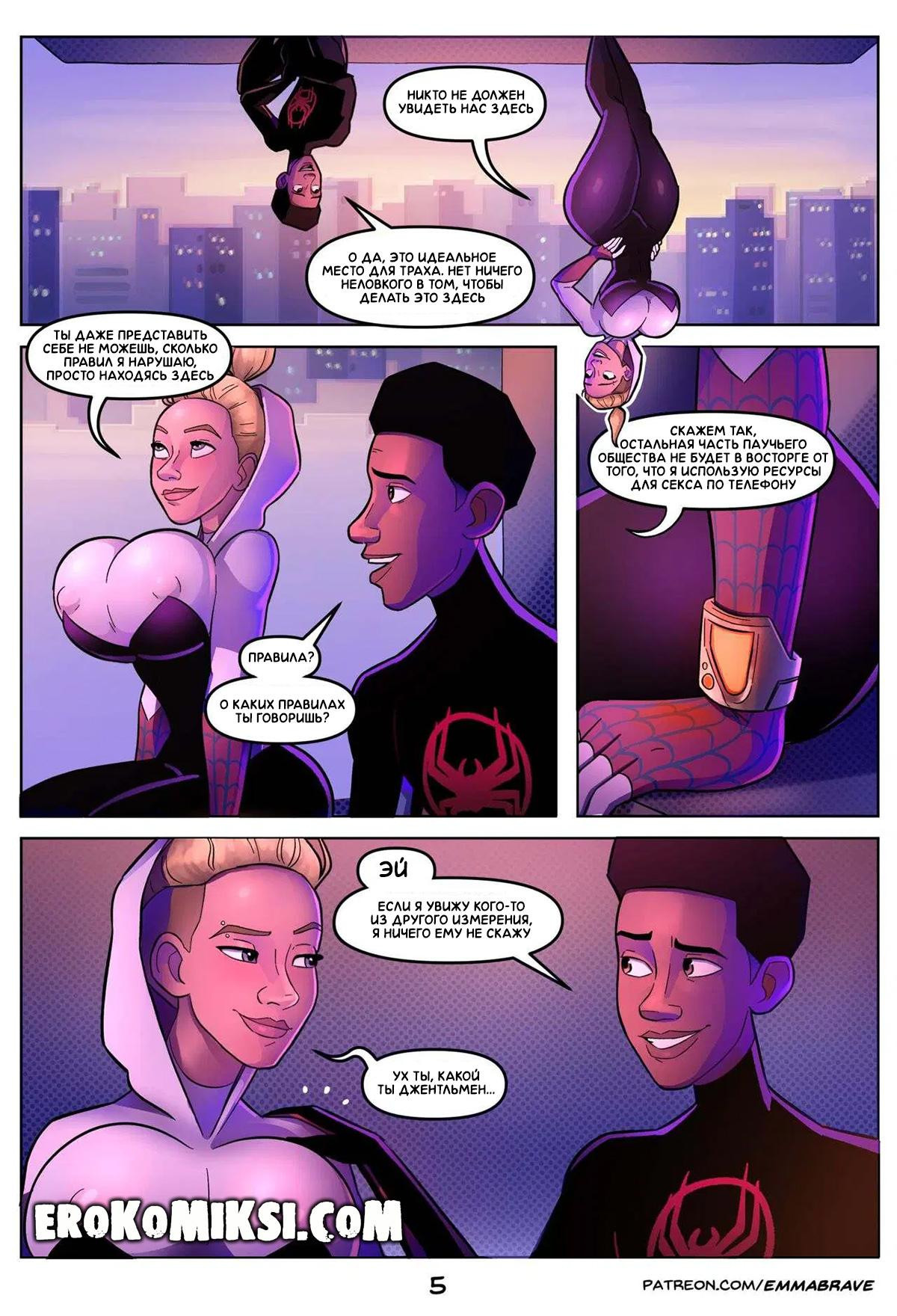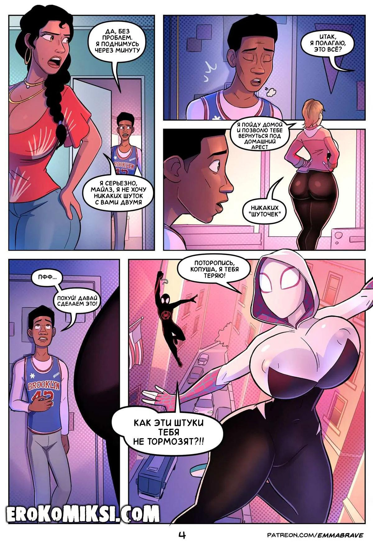 Порно комикс Spider-Man. Перемещение между Вселенными. Майлз спокойно лежал в своей комнате и слушал музыку, как вдруг, в его комнату нагрянула Гвен. Майлз не ожидал внезапному появлению своей подружки, а когда взглянул на неё, так и вовсе опешил, потому что Гвен кардинально выросла в области сисек и задницы. На удивлённое выражение лица Майлза, Гвен ответила, что она перемещается между вселенными и из-за этого, у неё очень сильно увеличиваются интимные части тела…