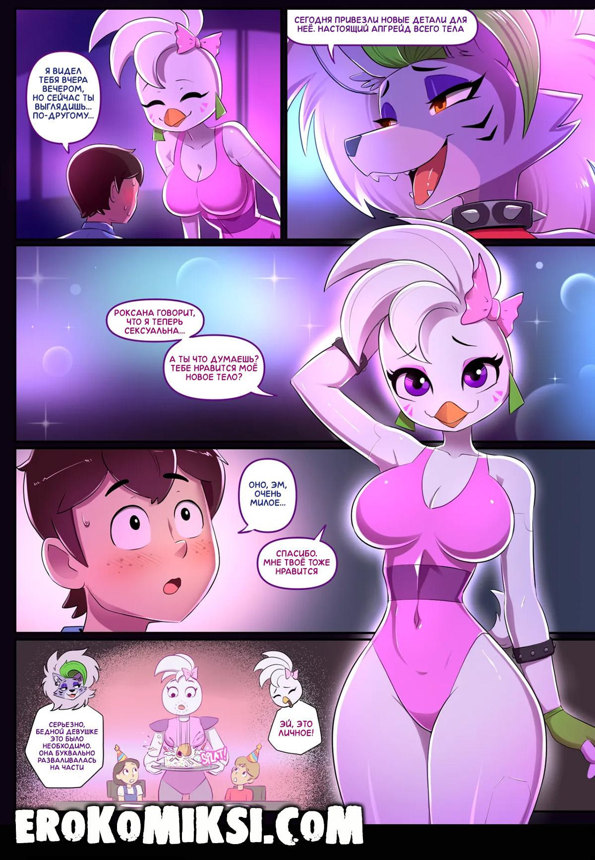 Порно комикс Пять ночей с Фредди. Ночная смена. Часть 2. После фантастической ночи с Рокси, Майк решил встретиться с красавицей и во время следующего своего дежурства. Но парня ждал сюрприз, так как в этот раз, Рокси была не одна, а со своей подружкой Чикой, которая, услышав от Рокси про ночь с Майком, тоже захотела попробовать его член…