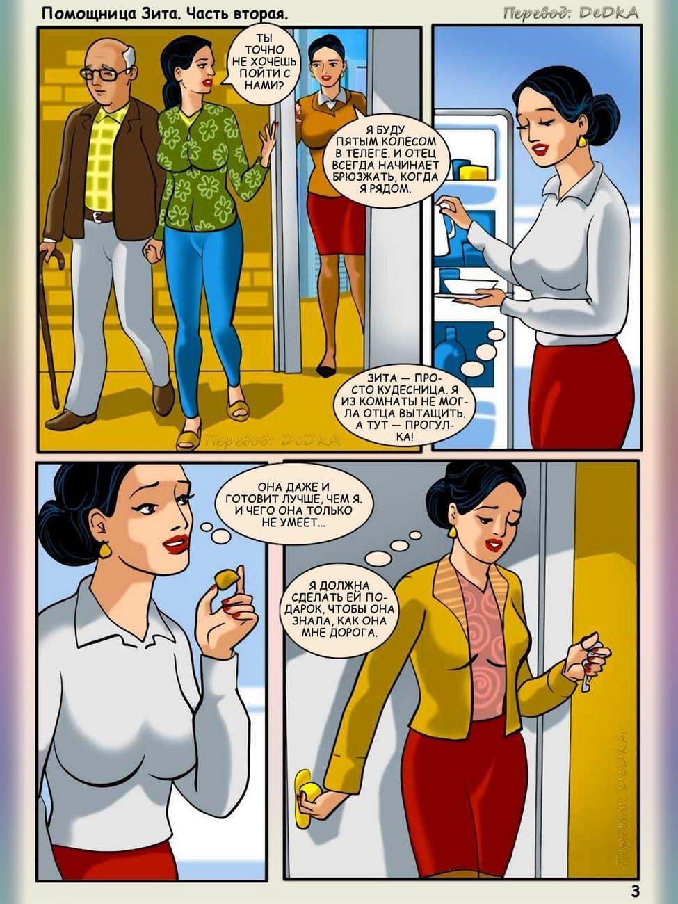Пожилой Шом от бережного обихода и регулярного секса с сиделкой Зитой стал выздоравливать на радость дочери, и Гита захотела подарить своей подруге какой – нибудь подарок. Но Зита не вникла, что сюрприз ей сделала Гита, она подумала, что он от Шома, и по своему благодарит его, а в скором времени дочь уже наблюдает сексуальную сцену, в которой развратничают ее отец и подруга детства. В плохом настроении она выходит из дома. Когда же Гита вновь приходит домой, то снова видит постельный перепихон. Гита не довольна, но все же ей тоже очень хочется получить райские удовольствия и помощница Зита решает помочь ей, о чем вы сможете прочитать онлайн в данном секс комиксе.