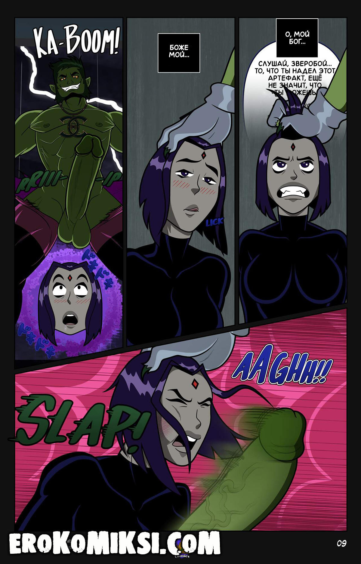 Порно комикс Юные Титаны. Животные Инстинкты. В одну дождливую ночь, у Рейвен наконец-то нашлось время побыть одной и спокойно почитать свою любимую книжку. Но внезапно, появился Зверобой, который вёл себя довольно странно и начал проявлять агрессию к Рейвен. Девушка постаралась усмирить зверя, но все её попытки оказались тщетны из-за ожерелья, которое Зверобой нашёл и надел. Это магическое ожерелье, которое даёт звериную силу и максимально увеличивает мужскую силу…