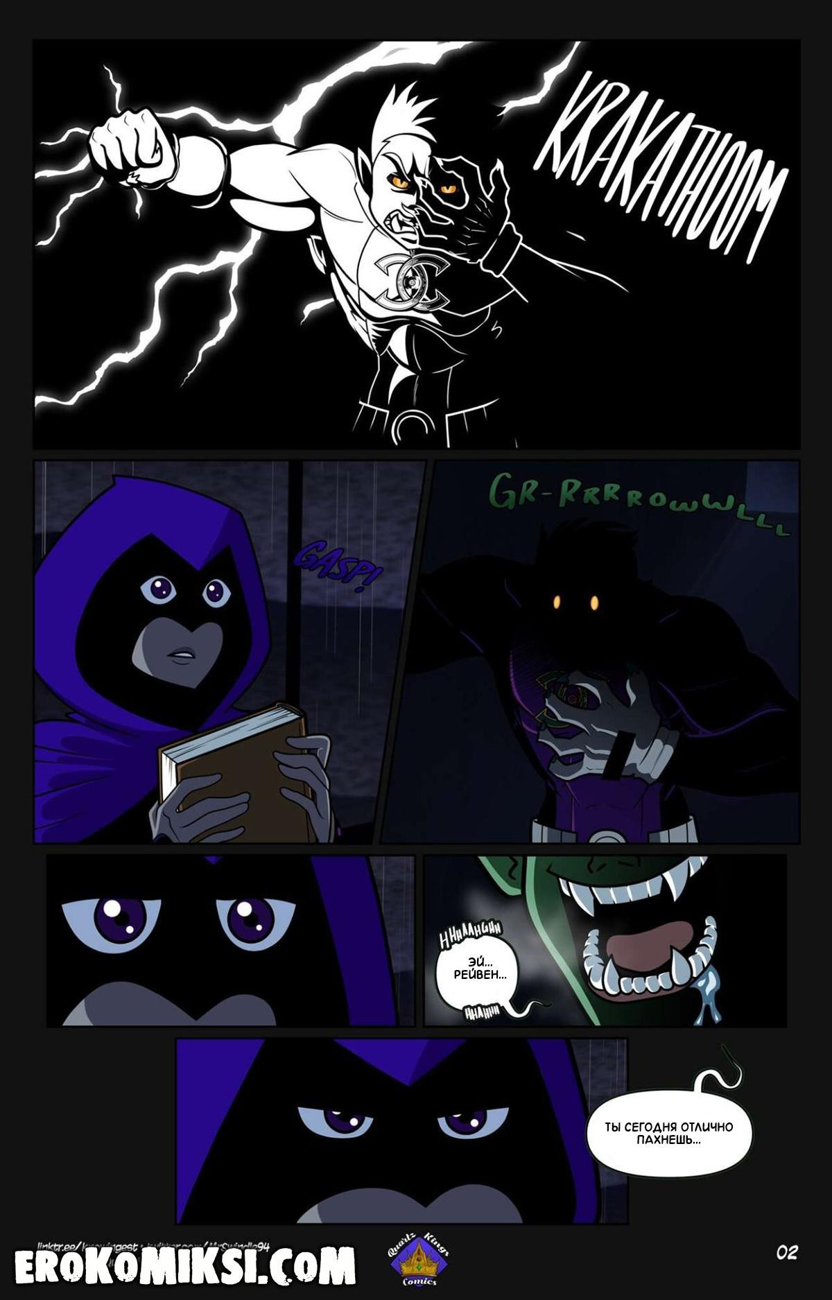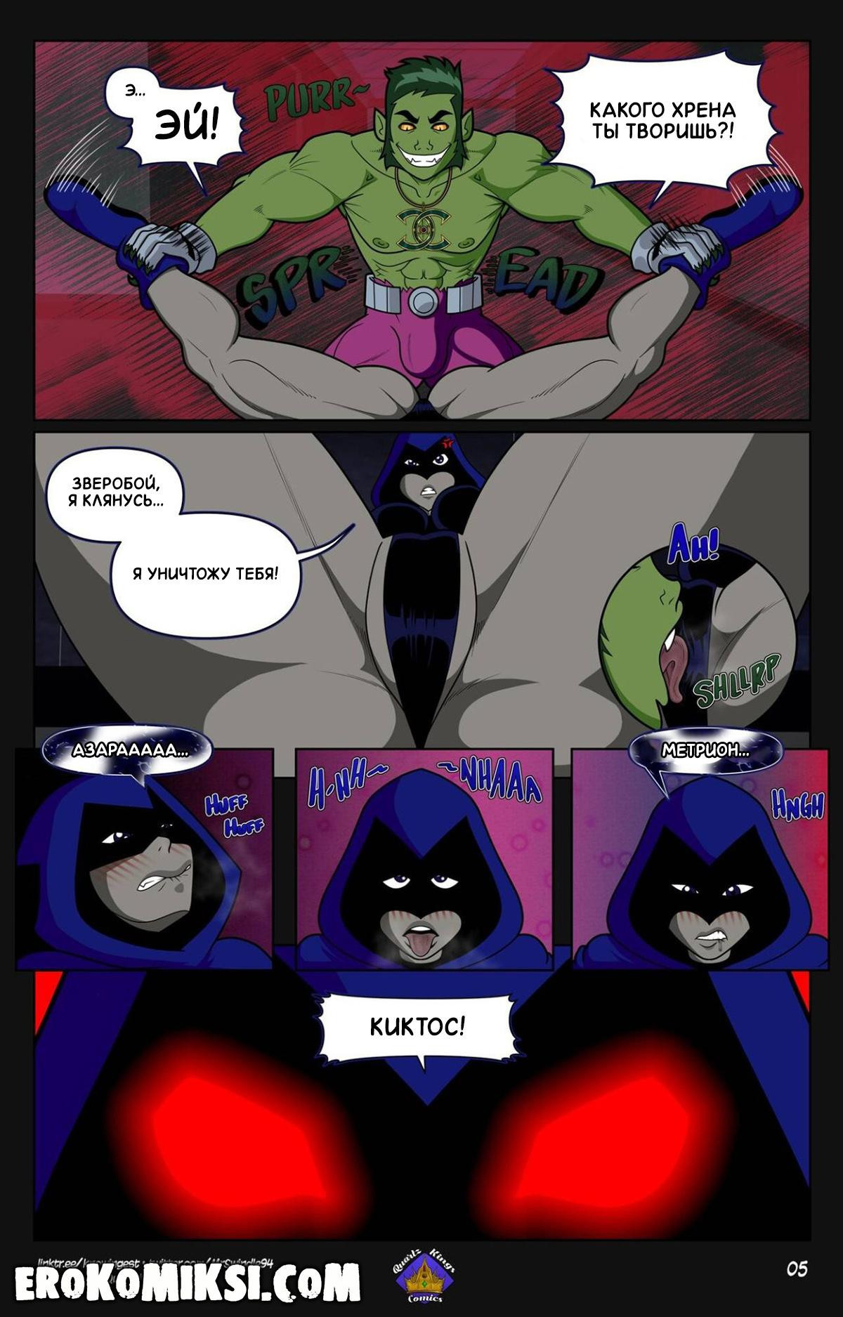 Порно комикс Юные Титаны. Животные Инстинкты. В одну дождливую ночь, у Рейвен наконец-то нашлось время побыть одной и спокойно почитать свою любимую книжку. Но внезапно, появился Зверобой, который вёл себя довольно странно и начал проявлять агрессию к Рейвен. Девушка постаралась усмирить зверя, но все её попытки оказались тщетны из-за ожерелья, которое Зверобой нашёл и надел. Это магическое ожерелье, которое даёт звериную силу и максимально увеличивает мужскую силу…