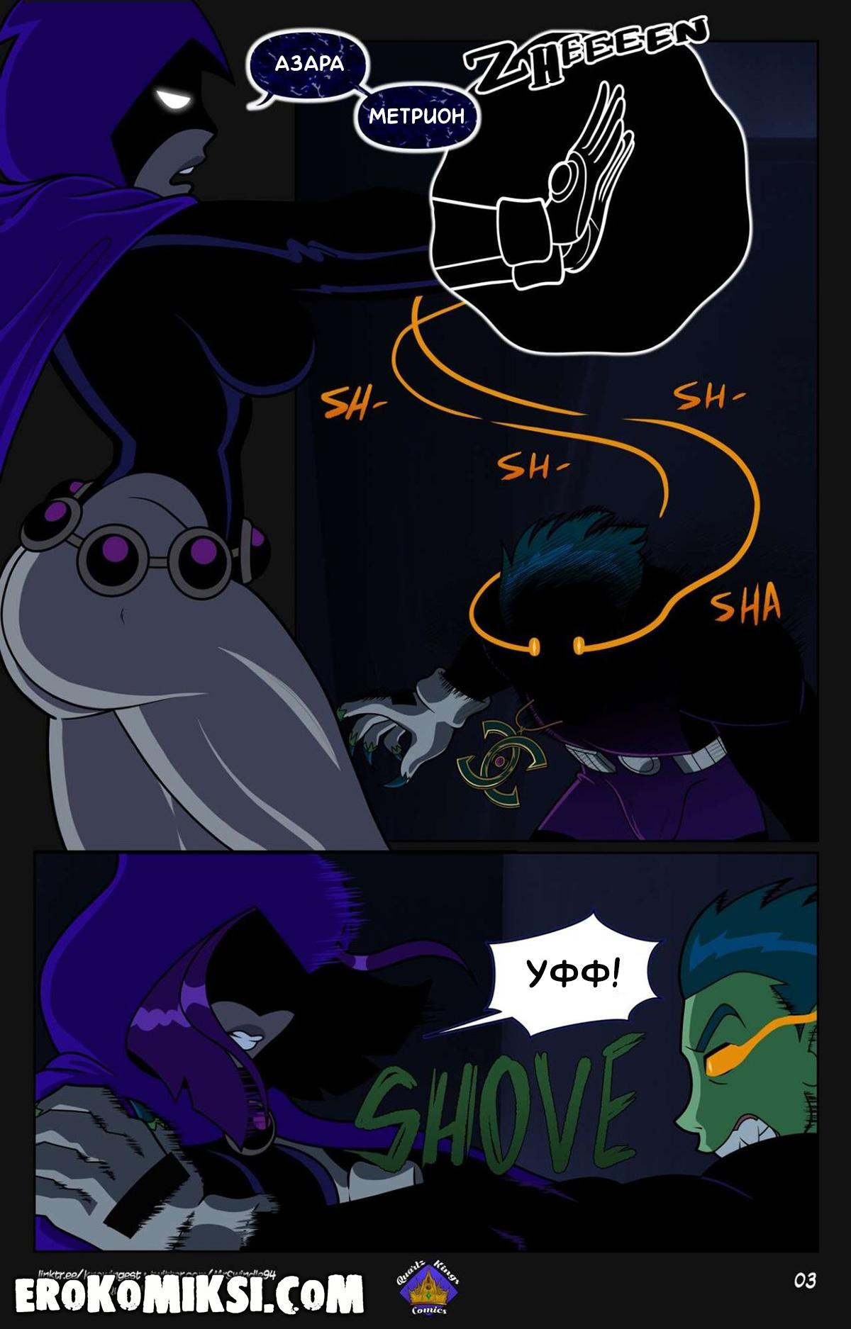 Порно комикс Юные Титаны. Животные Инстинкты. В одну дождливую ночь, у Рейвен наконец-то нашлось время побыть одной и спокойно почитать свою любимую книжку. Но внезапно, появился Зверобой, который вёл себя довольно странно и начал проявлять агрессию к Рейвен. Девушка постаралась усмирить зверя, но все её попытки оказались тщетны из-за ожерелья, которое Зверобой нашёл и надел. Это магическое ожерелье, которое даёт звериную силу и максимально увеличивает мужскую силу…
